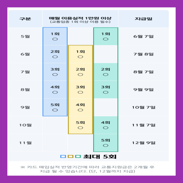 해당 카드로 대중교통, 코레일, 하이패스 등 교통 관련 비용을 포함하여 한 달에 1만원 이상 사용하면 다음달 7(휴일인 경우 다음 영업일)일에 신한은행 결제계좌로 지원금을 캐시백 형태로 받을 수 있습니다.