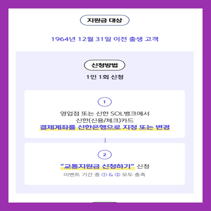 출생 기준이 맞는 고객들 중 신한카드 결제계좌를 신한은행으로 등록한 고객 선착순 6만명에 대해 매월 1만원 최대 5만원 교통지원금을 지급합니다